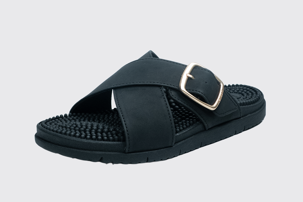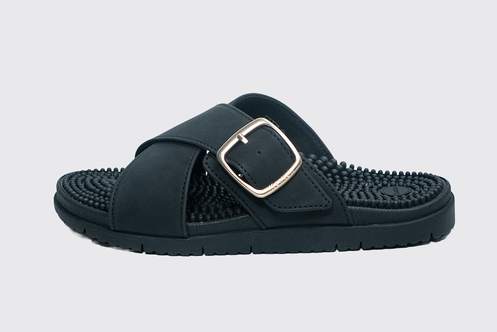Kawaii Acupressure sandals now in a graceful black, making it a must have for your collection. Crafted from a new, softer material that feels as elegant as it looks. The Kawaii sandals are perfect for smart casual occasions as they bring a touch of refinement to any outfit, whether you're dressing up or down.
